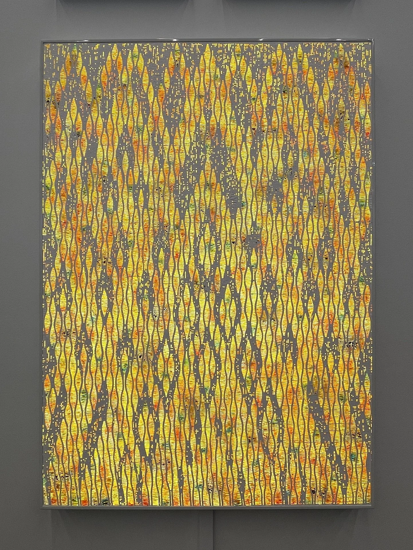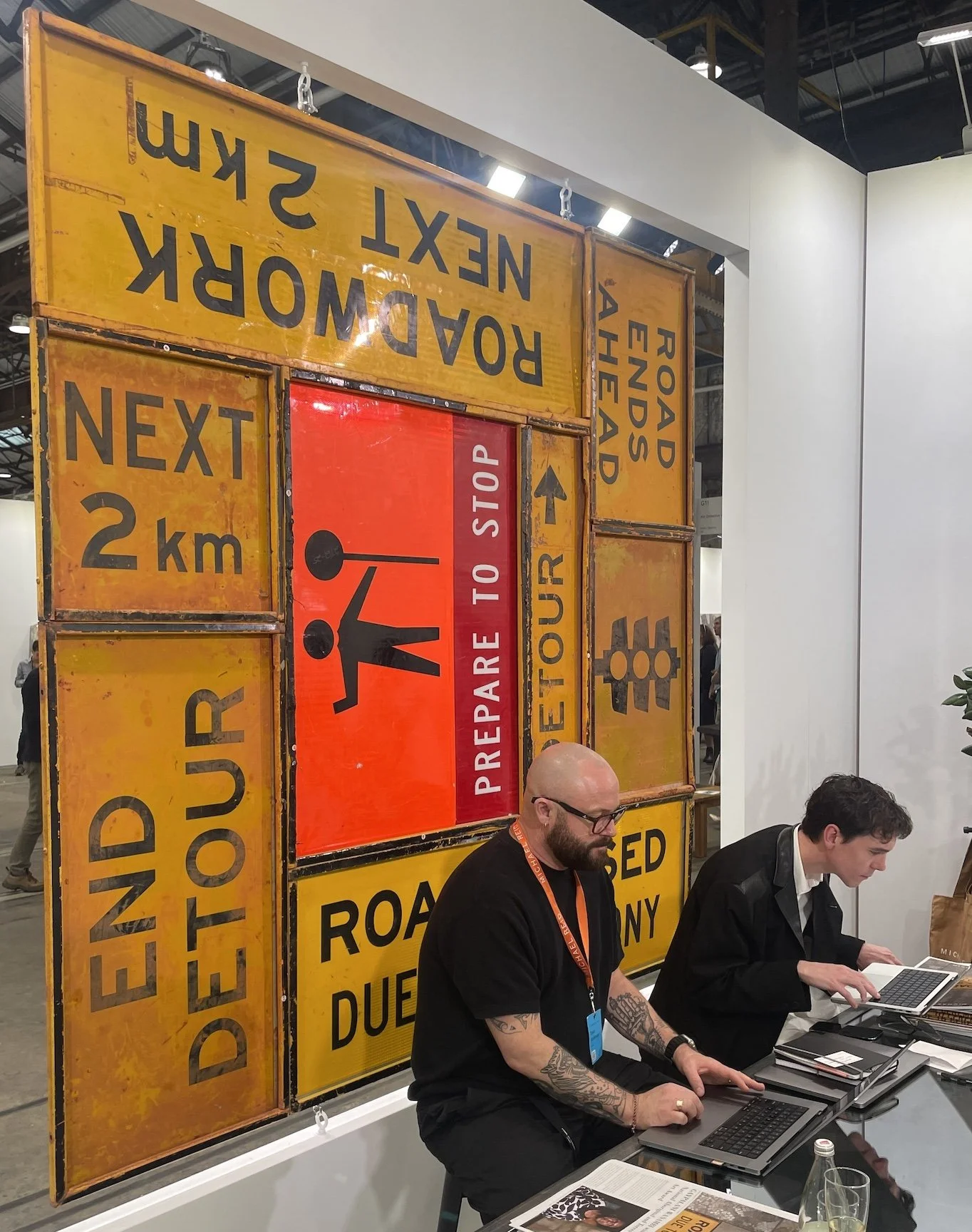 Sydney Contemporary is a multi-day event, spanning almost a week. This allows repeat visits and opportunities to keep discovering more. One thing that stood out was the strength and depth of artworks by indigenous Australians on display across a large number of booths. Two presentations stood out in particular – Gumatj Language by the late Nyapanyapa Yunupingu, and Dawurr by Gaypalani Wanambi. Presented by D’lan Contemporary, a gallery specialising in First Nations artists, Nyapanyapa’s work was made up 45 individual paper sheets, each drawn and painted on in a unique configuration of gestural marks. The composite effect was simply magnificent. It was one of only a few works that I had to return to again and again, taking in more detail and nuance on each visit. Wanambi’s work was presented by Michael Reid Gallery. Comprised of etched road signs, the work was a dazzling, two-sided assemblage. With one side beautifully etched in mesmerising patterns and the other showing the road signage still with a hint of reddish outback dust Dawurr was ethereal and earthy all at once.